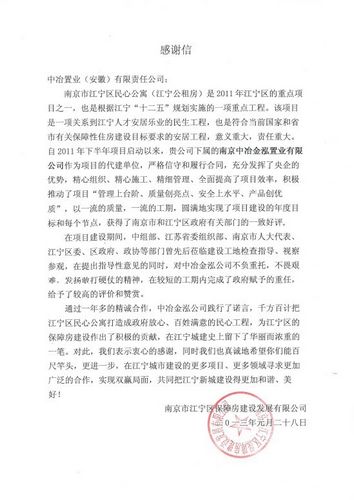 日前,中冶置业(安徽)有限责任公司收到南京市江宁区保障房建设发展有限公司发来的感谢信,高度称赞南京中冶金泓置业有限公司在项目建设中圆满地实现了项目建设的年度目标和每个节点。