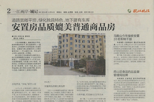 125,《皖江晚报》以《安置房品质媲美普通商品房》为题,报道了中国十七冶集团积极承担央企社会责任,承建的安置房品质媲美普通商品房。报道分别以中国十七冶集团承建的马鞍山安置房项目乔山嘉园小区和金福花园为例,报道了中国十七冶集团承建的安置房水电齐全,“拎包”即可入住,品质堪比商品房。报道指出,中国十七冶集团从材料进场开始,严把每道程序关,严格按照图纸规范施工,并加强过程控制,确保项目质量可控。
