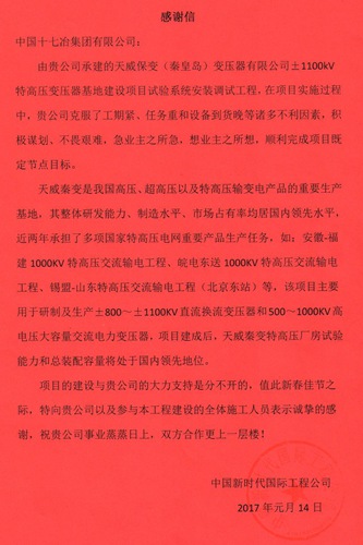 1月16日,中国十七冶集团收到中国新时代国际工程公司发来的感谢信,感谢十七冶冶金工程技术公司在承建天威保变(秦皇岛)变压器有限公司±1100kV特高压变压器基地建设项目试验系统安装调试工程中,克服了工期紧、任务重和设备到货晚等诸多不利因素,积极谋划、不畏艰难,急业主之所急,想业主之所想,1月13日一次性通过业主验收,顺利完成项目既定节点目标。