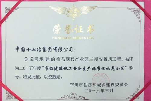 日前,由中国十七冶集团房屋工程技术公司承建的宿马三期安置房项目荣获“市级建筑施工安全生产标准化示范小区”称号。