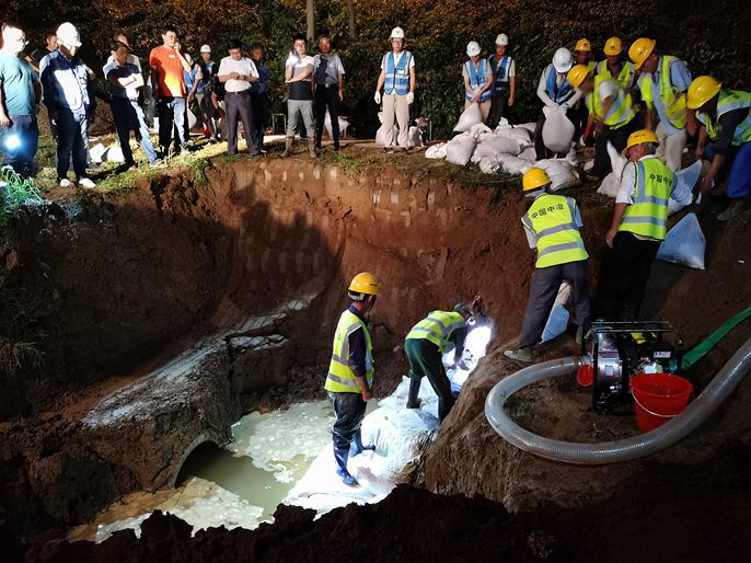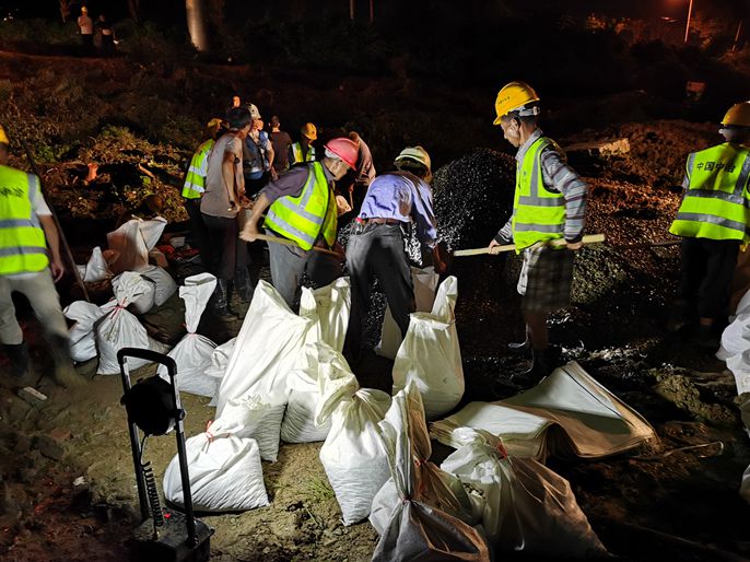 晚上8点,又开始下起毛毛细雨,基坑下挖到2米的时候终于看见预埋管道,当管道整体浮现在眼前时,田璐的神情立即紧张了起来。排污管错位严重,管道接口处出现裂缝!这是管涌造成的,夹杂着泥土的浑水冲进裂缝,如果不及时阻止,管道将会被泥土堵塞,届时,水坝护坡将会发生坍塌!“快,赶快下钢丝网片,大家一起跟我赶快装袋。”田璐拿起铁锹,雨水混着汗水流淌在脸上。突击队员纷纷拿起蛇皮袋、铁锹、手电,在风雨中进行作业,大雨不停,大干不歇。在挖机大灯的照射下,众人排成一条长队,你传我,我传你,装满石子的蛇皮袋一包一包的往基坑里运输,一直持续到晚上11点,200多袋石袋填满整个基坑,稳固了水坝护坡。