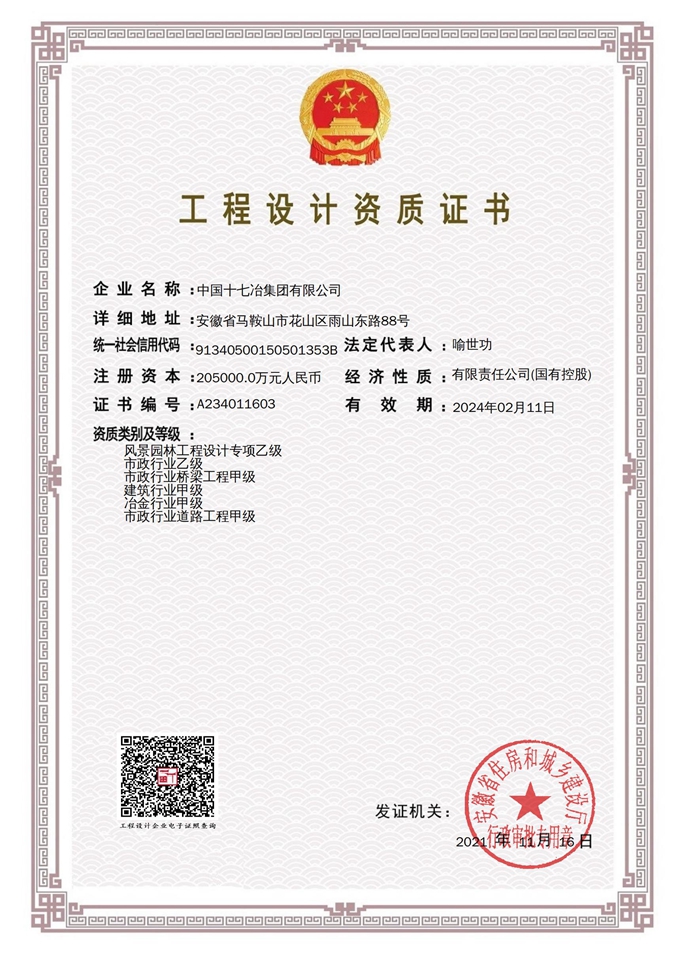 11月16日,中国十七冶集团获市政行业道路和桥梁工程甲级设计资质证书。