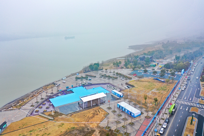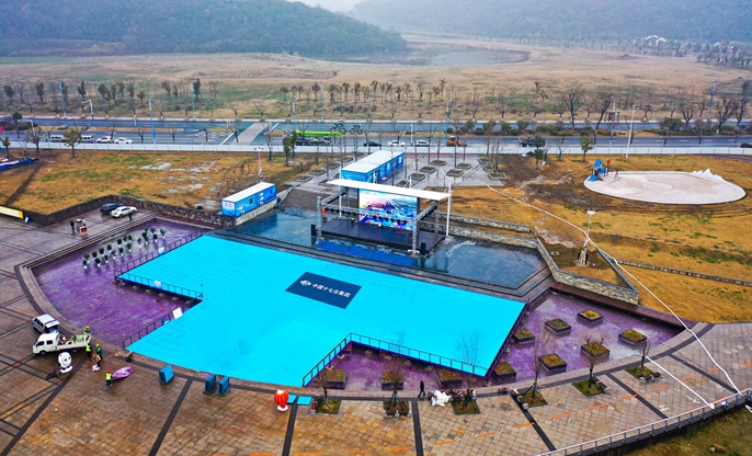 为确保冬奥会开幕式前全面完成改建任务,十七冶项目团队在绵绵小雨中实行两班全天制施工,先后完成冰川乐园沙子摊铺、地灯安装、冰川雕塑安装、冬奥旗帜安装、奥运五环安装等。水池上方铺设的蓝色钢化玻璃倒映出蓝蓝的天空,围挡上、建筑上到处都是有关冬奥会的相关图片及介绍,整个广场内外处处洋溢着浓厚的冬奥会氛围,面向长江的巨大4K屏幕也已进入最后的调试阶段。冬奥广场临近采石矶风景区,十七冶邀请到多位著名的手绘画家,在樱花大道附近的多个集装箱表面上,将各种样式的李白画像与其诗词栩栩如生地画在其上,在冬奥与残奥期间用于售卖冬奥手办礼及演员化妆间,李白元素与冬奥元素相互映衬妙趣横生。
