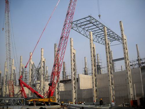 221上午,伴随着喜庆的鞭炮声,大连特钢项目一次料场第一跨屋架成功吊装到位,它标志着该项目一次料场屋面系统进入了快速安装的重要阶段。