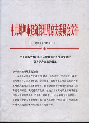 在党的生日到来之际,蚌埠市建管局党总支通报表彰了2010—2011年度蚌埠市外来建筑企业5名优秀共产党员,城建工程技术公司蚌埠项目部党支部书记尹开金和副经理胡维东被授予“优秀共产党员”称号。