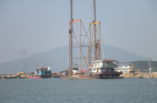 目前,长达14公里的堤岸工程施工沿线,水上挖泥、砂垫层、塑料排水板、抛石;陆上场地整平、砂垫层、软基处理等分项工程全面展开。