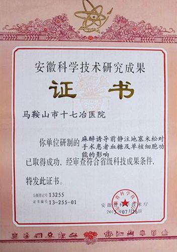 近日,由马鞍山十七冶医院麻醉科承担的安徽省科研基金项目“麻醉诱导前静注地塞米松对手术患者血糖及单核细胞功能的影响”顺利通过省科技厅的鉴定与验收,并获得技术成果证书。