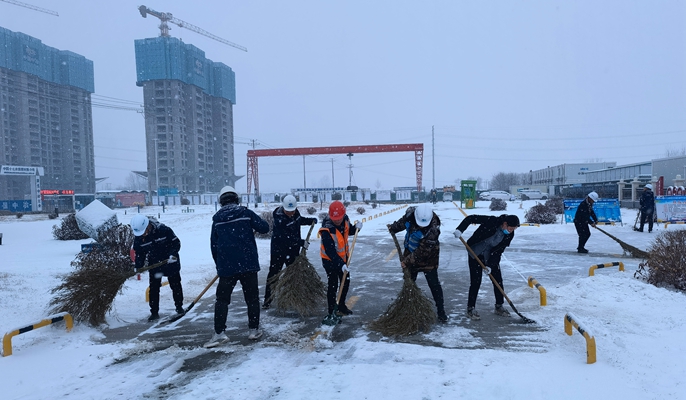 2月13日,河北省保定市气温骤降,风雪交加。为保障出行安全,中国十七冶集团房屋分公司保定ABO项目二标段各部室成员纷纷拿起扫帚、铲子在项目现场周边主路上开展扫雪义务活动,并对项目安全通道、作业平台、爬架、卸料平台等区域进行全面清理,在确保来往车辆道路畅通,保障出行安全的同时,为现场大干创造安全的生产环境。