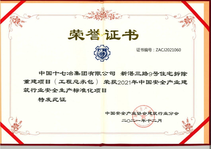 12月17日,中国十七冶集团收到中国安全产业协会建筑行业分会颁发的荣誉证书,山东分公司承建的青岛新湛三路9号住宅拆除重建项目荣获“2021年中国安全产业建筑行业安全生产标准化项目”称号。
