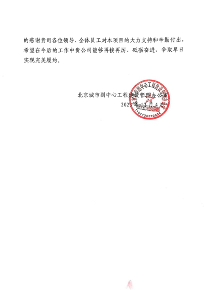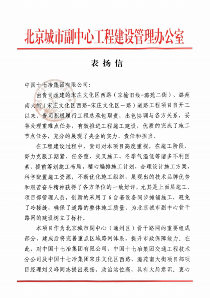 12月4日,北京城市副中心工程建设管理办公室向中国十七冶集团致表扬信,对交通分公司宋庄文化区西路、潞苑南大街项目团队积极履行总承包单位职责,出色协调各方关系,妥善处理难点任务,有效推进工程建设提出表扬。