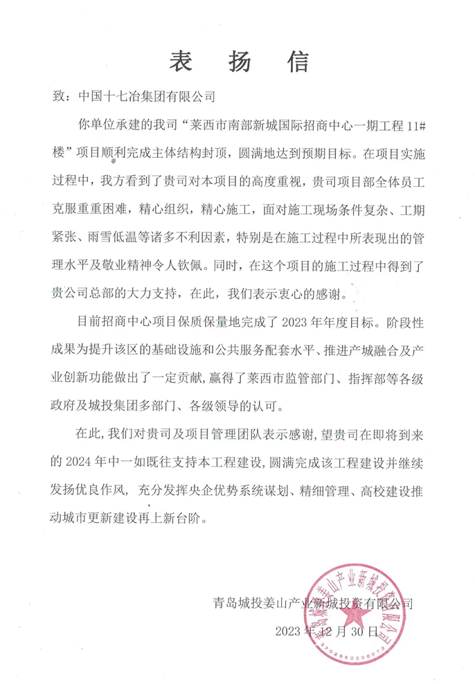 近日,青岛城投姜山产业新城投资有限公司向中国十七冶集团致表扬信,对青岛分公司莱西南部新城国际招商中心(一期)项目团队如期实现封顶目标,圆满完成年度各项建设任务提出表扬。