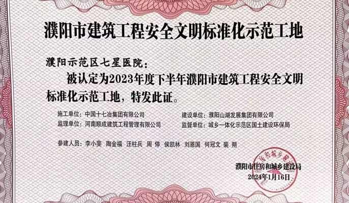 近日,从河南省濮阳市住建局获悉,中国十七冶冶金分公司濮阳示范区七星医院项目获评市“2023年度下半年建筑工程安全文明标准化示范工地”,大数据智慧生态产业园项目获评市“职工职业技能竞赛起重装卸机械操作工决赛团体三等奖”。