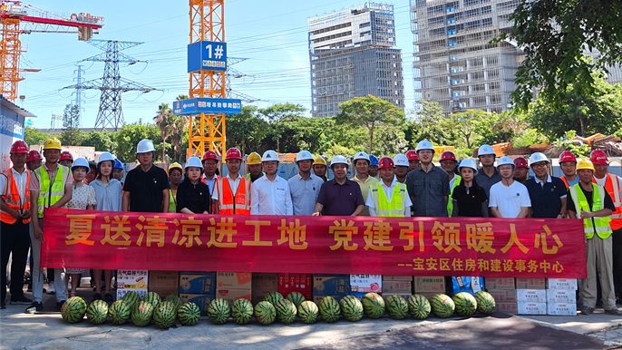 7月10日,深圳市宝安区住房和建设局事务中心副主任林雄聚一行,到中冶华南承建的芙蓉科技大厦项目开展“夏送清凉进工地,党建引领暖人心”活动。