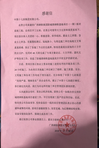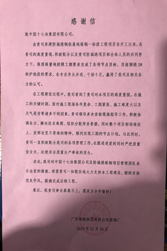 12月30日,中国十七冶集团收到广西钢铁集团热轧厂发来的感谢信,对冶金工程技术分公司项目部管理团队保质保量完成各项节点目标给予高度赞誉。