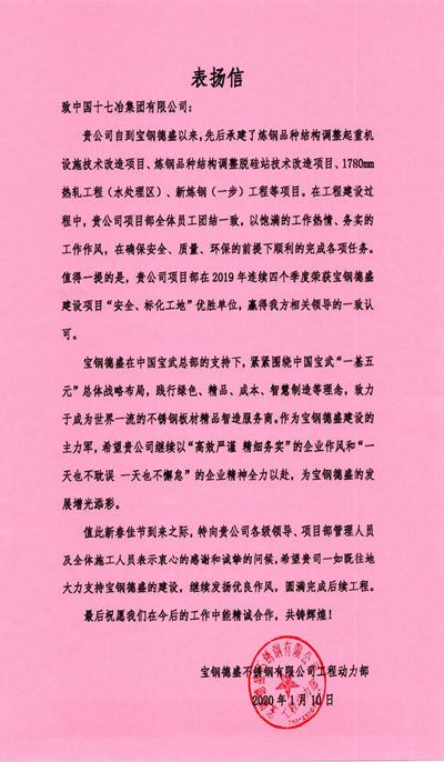 1月10日上午,中国十七冶集团收到了来自宝钢德盛不锈钢有限公司发来的表扬信。
