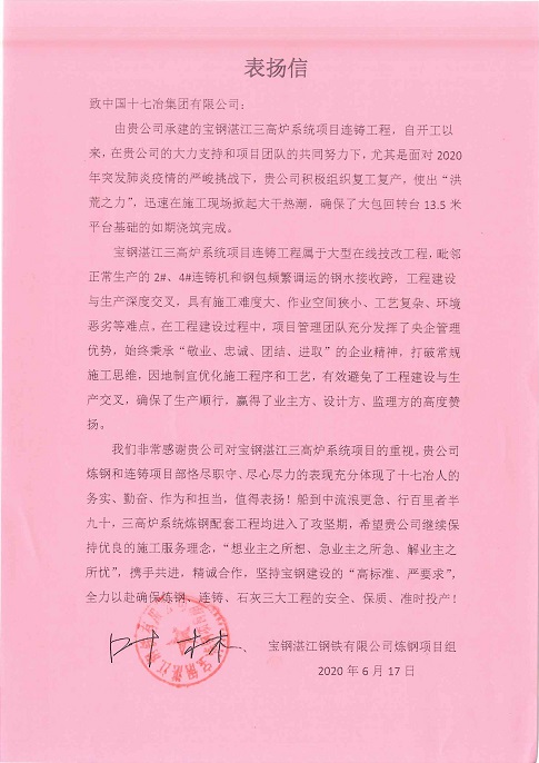 6月19日,宝钢湛江钢铁有限公司炼钢项目组向中国十七冶集团发来表扬信,对中国十七冶集团冶金工程技术分公司宝钢湛江钢铁连铸项目部积极推动工作的有序开展、按期完成施工任务提出表扬。