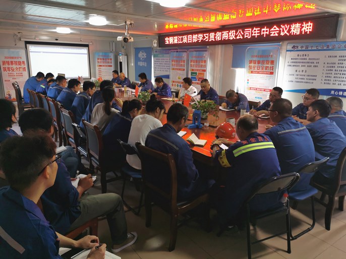 7月21日,宝钢湛江项目部召开两级公司年中会议精神传达贯彻专题会。组织项目部全体成员深入学习会议精神,安排部署具体贯彻落实工作。