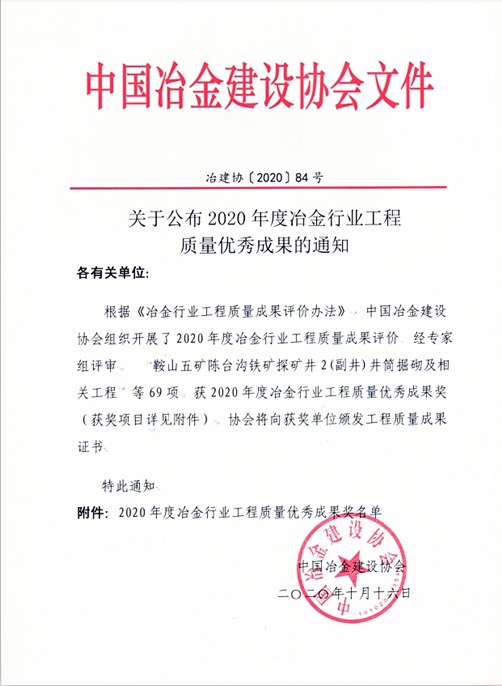 “冶金行业工程质量优秀成果奖”,每年由中国冶金建设协会组织在全国冶金建设行业评选一次,旨在落实国家《质量振兴纲要》,鼓励建设、勘察设计、施工、监理企业加强科学管理,提高工程质量和投资效益,培育行业品牌。每项获此殊荣的工程均代表了当今全国冶金行业的最高水平。项目部凭借工程领域的技术创新、施工工法工艺革新、工程管理和应用效果等多方面的突出表现,最终获得此项荣誉。