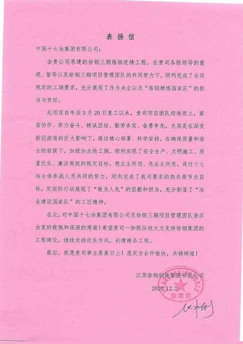 12月2日,中国十七冶集团收到来自江苏徐钢钢铁集团发来的表扬信,对冶金工程技术分公司承建的徐钢三期炼钢连铸工程项目管理团队的努力拼搏和辛勤劳作表示赞扬与感谢。