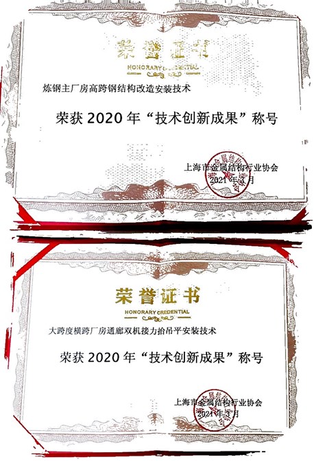 4月15日,上海市金属结构行业协会在上海召开七届三次会员代表大会暨2020年金属结构行业“技术创新成果”和“优秀技术人员”表彰大会。中国十七冶集团申报的《炼钢主厂房高跨钢结构改造安装技术》和《大跨度横跨厂房通廊双机接力抬吊平移安装技术》两项成果获此荣誉。