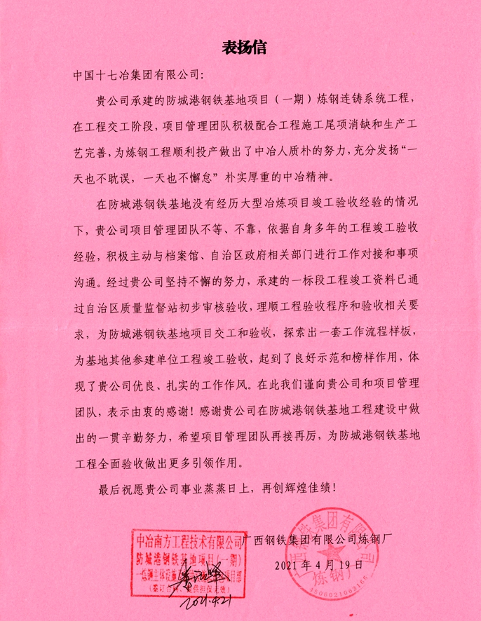 信中还表示,在防城港钢铁基地没有经历大型冶炼项目竣工验收经验的情况下,十七冶项目管理团队不等、不靠,依据其自身多年的工程竣工验收经验,积极主动与档案馆、自治区政府相关部门进行工作对接和事项沟通,为基地项目竣工验收做出了很好的工作探索和带动作用。希望项目管理团队继续发扬十七冶人敢想敢干、吃苦耐劳的工作精神,为实现广西钢铁2021年结(决)算转固定资产力争完成150亿元的目标,做出更多引领带动作用。