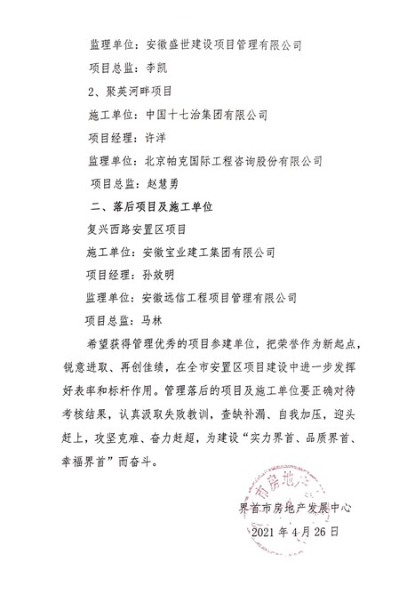 此次界首市“优秀项目及施工单位”荣誉称号的获得,将进一步鞭策和激励项目部全体锐意进取、再创佳绩,争取在全是安置区项目建设中进一步发挥好表率和标杆作用,为建设“实力界首、品质界首、幸福界首”而不懈奋斗,以优异成绩献礼建党100周年。