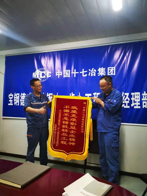 5月26日晚,一面印有“攻坚克难彰显企业精神 不懈不怠铸就精品工程”的锦旗送至十七冶宝钢德盛新炼钢(一步)项目部,这是对项目部在施工过程中面对重重困难,仍奋勇向前、拼搏奋斗精神的肯定,也是对十七冶集团在宝钢德盛发展建设中作出的突出贡献给予高度赞扬及感谢。