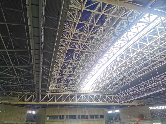 兰州奥体中心网球馆属于兰州奥体中心的场馆之一,位于奥体中心的南区东侧部位,其结构平面投影呈正八边形,地上总建筑面积为11500平方米,屋顶最高处标高达到28米。叠合式水平移动可开合屋盖平面投影面积约28米*40米,钢结构材料选用Q355C,活动屋盖主桁架沿跨度方向进行预起拱,起拱值为活动屋盖跨度的1/500,结构设计分为全开、全闭、半开的多种状态,可以使建筑物同时具有室内和室外两个使用功能。其中钢结构部分采用落地桁架、空间桁架水平可开合屋盖组成。