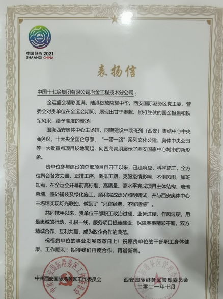 11月12日,中国十七冶集团冶金工程技术分公司收到中共西安国际港务区工作委员会和西安国际港务区管理委员会的表扬信。信中对我公司中冶集团西北区域总部项目在中国十四运期间的表现给予充分肯定,对集团公司的工程产品和服务态度表示高度认可。