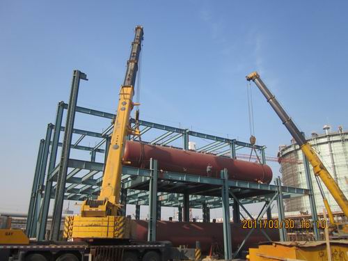 截止目前,4台蓄热器全部安装就位,本次安装的4#蓄热器在国内目前同类设备中属较大的设备,其长24m,直径为3.2m,单重130t,位于▽8.400m平台上,采用2台250t汽车吊进行抬吊。本次吊装作业属于“超过一定规模的危险性较大的分部分项工程”,项目部编制了科学的技术方案,并通过了集团公司专家及外部专家的严格评审,各环节均按方案有序地进行。