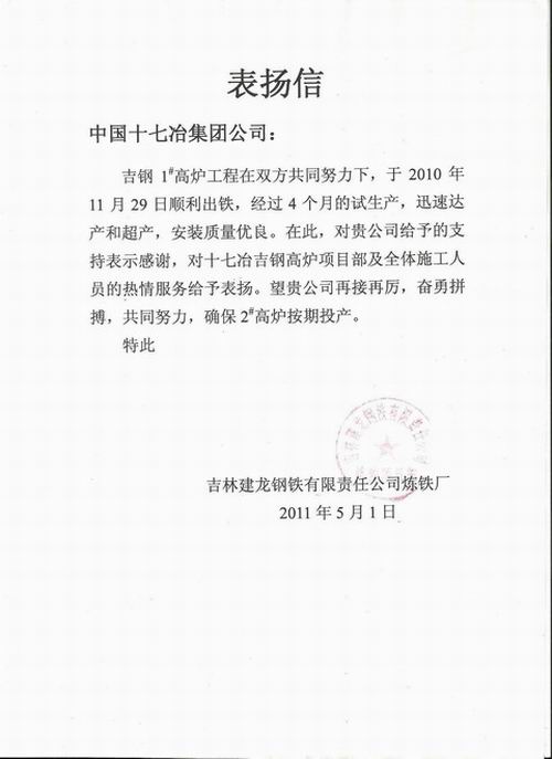 五一期间,吉林建龙钢铁有限责任公司炼铁厂致信十七冶集团公司,表扬十七冶承接的吉钢一号高炉安装质量优良。