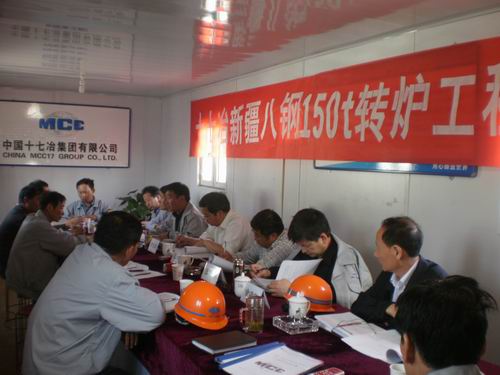 上午九点,唐灶荣副总经理、项目监管部部长范文刚、副部长赵峰、预结算部长张伟典、计划财务部副部长余孝华等领导来到新疆150t转炉工地,视察了现场施工进展情况。在随后召开的工程推进会上,八钢项目经理部经理邢飞同志对转炉工程前期工作准备以及前期施工的进度管理情况进行了总结汇报,根据总体网络节点细化了下一阶段的工作计划和布置;同时对重大节点和人力资源、技术支持、安全保证体系及措施进行了整体的安排和汇报。城建公司项目负责人及领导也进行了工作安排及表态发言,落实资源配置和具体措施,确保宝钢钢构5月底钢柱进场吊装。集团公司部门负责人在充分肯定项目部的前一阶段工作同时,也对工程各项管理工作提出了指导性建议和要求。