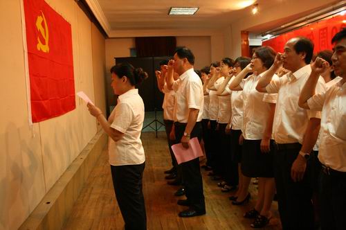 公司党委书记周美初主持了会议,全体党员面对着党旗共同宣誓:“我志愿加入中国共产党,拥护党的纲领,遵守党的章程,履行党员义务……”