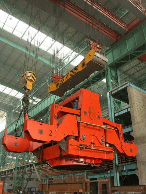 随着一声令下,只见这个外形庞大的大包回转台缓缓的升起,此大包回转台与以往不同,引进意大利DANIELI进口设备,重量达到140吨,高7米,最大宽度11.8米,吊装高度15.5米,蝶形臂和旋转塔是用推力球连接,吊装前必须进行固定。在设备滞后的情况下,大包回转台从远离现场组装到吊装历时三天的时间,此次吊装是马钢电炉项目设备安装中难度最大的一项内容。回转台处于连铸厂房D列线正中,采用的方法是用DE跨250t与CD跨120t桥式起重机共同抬吊就位,安装工程中得到了马钢电炉厂的大力配合,选用了最优秀的2名行车工,与机装四处的全体参战员工一起,加班加点,在冶金公司领导的指挥下,圆满完成了这一重大节点,体现了冶金公司在人力、技术等方面的综合实力,为此工程的顺利完工打下了坚实的基础。