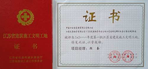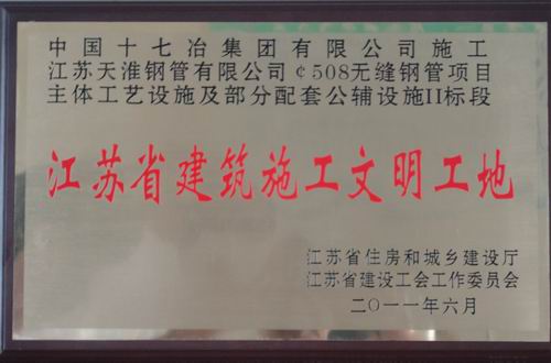 近日,由十七冶江苏天淮项目经理部承建的江苏天淮¢508无缝钢管工程,经江苏省住房和城市建设厅、江苏省建设工会工作委员会审定批准,被授予“江苏省2011年建设施工省级文明工地”荣誉称号。