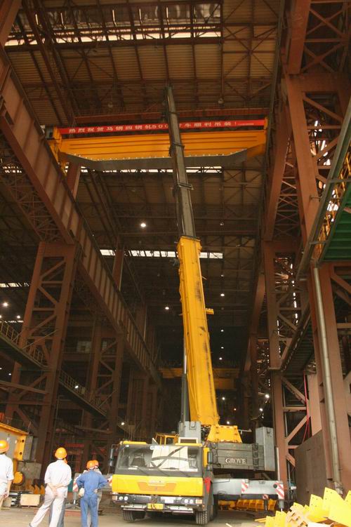马钢新区后期结构调整项目钢区工程在加料跨和钢水接受跨个增加一台500/100t行车,该行车是目前我国冶金行业最大的桥式起重机,主钩设计额定起重量为500t,单梁最大吊装重量为85t,由于一期主厂房已施工完毕,跨内吊装难度大,经过项目部工程技术人员对现场的反复勘察,精确计算,合理选择大型汽车吊进行吊装作业,确保了A梁、B梁一次吊装成功,充分展示了十七冶吊装大型设备的实力,受到了业主和相关单位的一致好评。