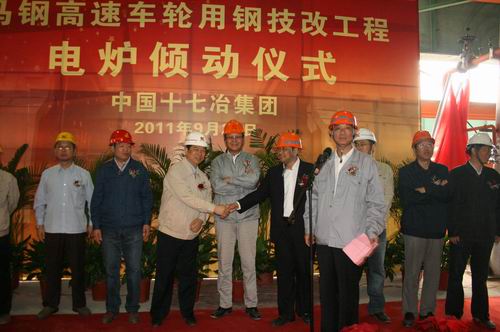 9月20日上午9点18分,伴随着喜庆的音乐和鞭炮声,马钢高速车轮用钢技术改造工程电炉倾动仪式隆重举行,马钢集团公司董事长、党委书记顾建国;马钢集团公司副总经理高海建;中国十七冶集团公司总经理喻世功、总经理助理王青山亲临仪式现场。马钢各参建公司领导;康卡斯特公司马钢电炉项目现场经理古斯塔瓦;马钢电炉厂项目部领导和员工代表以及十七冶马钢项目部领导和员工代表近150人参加了仪式。