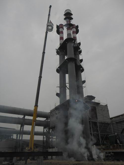 10月23日下午3点38分,梅钢炼钢公辅工程一次除尘放散塔烟囱顺利吊装完成。