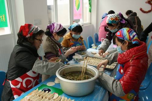 下午2点整,食堂里人头攒动,热闹非凡。比赛场地布置的充满节日的气氛,四组选手通过抽签组合,形成了“白菜队”、“辣椒队”、“玉米队”和“茄子队”!大家从洗菜、切菜、拌馅到开始包,争分夺秒,小食堂里充满了菜香、肉香和欢声笑语,裹了肉馅的饺子皮在指尖一揉搓便变成了一个美观的饺子,大家驾轻就熟的神态透露着自信和专注。 “应该一半人准备,一半人包”,“不对,5人一起包快!” 看到有的饺子皮太干,就建议“弄点水,弄点水方便捏住”;有人比赛时显得紧张,旁人提醒“手不要抖,慢慢来”,……时不时的讨论让气氛更为热烈。比赛要求饺子要饱满、干净、还要美味可口,所以各队并没有一昧追求数量,各组的饺子虽然包的大小、形状各不相同,有圆有扁,但都显得饱满诱人,摆放的形式也是花样百出。
