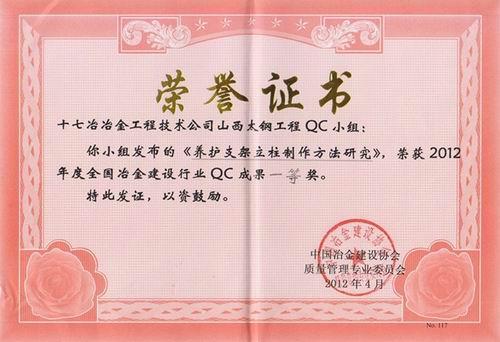 十七冶集团公司共有六项QC成果参加本次评审,经过十五位专家现场评审打分,冶金工程技术公司山西太钢工程发布的《养护支架立柱制作方法研究》荣获一等奖,冶金公司天淮工程《控制大面积地坪质量》、城建工程技术公司《海螺大厦高大混凝土圆柱外观质量控制》和《提高超高核心筒砼平整度及垂直度》、市政工程技术公司《降低地下室后浇带渗漏率》、工程设备技术公司《沿海滩涂桩基漂移处理》等五项成果获二等奖。