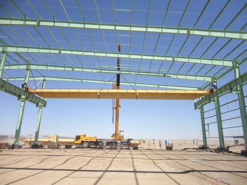 5月20日下午5点58分,由十七冶冶金工程技术公司承建的新疆宝钢克拉玛依管加工工程跨距为28.5米的两台10吨行车开始吊装,这标志着该工程管加工车间设备正式进入安装阶段。 管加工车间设计长114米,宽60米,共两跨,跨距30米,屋脊高12.5米。设计行车两台,每台行车自重34.445吨,跨度28.5米,起重负荷10吨。新疆克拉玛依每年4至6月正值高温和大风强沙季节,施工区域四周是茫茫的隔壁滩,遇到大风时现场就掀起漫天黄沙,能见度不足50米,项目部及机装五处员工做好防风护沙的防护装备,克服高温和强沙带来的干扰, 发扬十七冶人艰苦奋斗的拼搏精神,掀起大干30天的高潮, 保质、保量、保安全,将精细化管理落实在现场实处,为十七冶在新疆区域的建设发展做出自己的贡献。