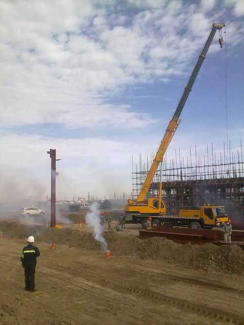 7月25日8时58分,随着维修间厂房柱第一吊成功吊装,标志着青海盐湖金属镁钢结构安装工作拉开了序幕。