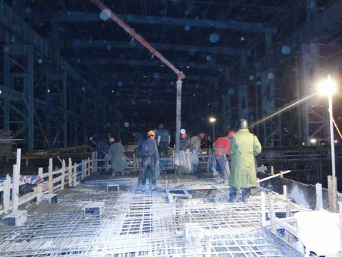 此次浇筑混凝土量2000多立方,螺栓套管640个,施工工艺十分复杂。为保证施工安全和工程质量,项目部人员轮流值班,在零下五六度的夜间仍坚守施工现场,连续奋战48小时,为主轧线设备基础全面贯通保驾护航。BD机、精轧设备基础浇筑完成为设备安装奠定了坚实的基础。