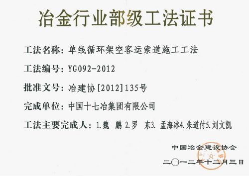 获得2012年度冶金行业部级工法的是《单线循环架空客运索道施工工法》和《插拔式高压终端制作工法》。这2项部级工法的成功获得,充分体现了公司对科技创新工作的高度重视、广大技术人员过硬的专业技术水平以及十七冶人为推进公司高质量可持续发展的持续创新精神。