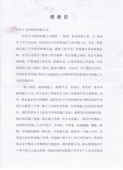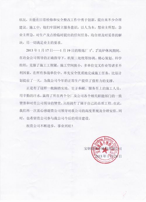 1月28日,宝钢德盛不锈钢有限公司向我公司致感谢信,感谢我公司安全、优质地完成了该公司烧结厂、粗炼厂机电检修工程检修计划,为该公司生产提供了安全环保的作业环境和有力保障。