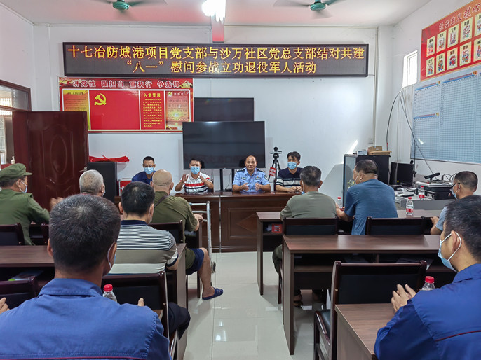 为深入贯彻习近平总书记关于双拥工作的重要论述和重要指示批示精神,进一步巩固和发展军政军民团结,7月29日,在“八一”建军节来临之际,中国十七冶集团防城港项目党支部联合沙社区党总支部结对共建,开展“慰问参战老兵”,重温峥嵘岁月”主题活动。