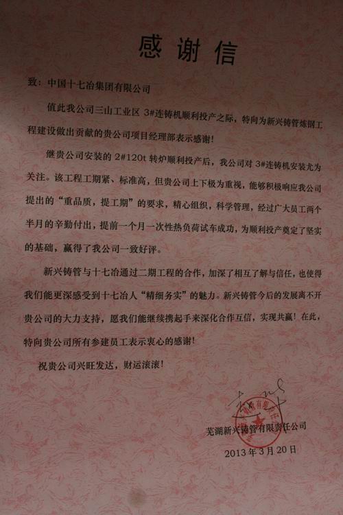 3月29日,正值我公司承建的芜湖新兴铸管三山工业区3#连铸机顺利投产之际,芜湖新兴铸管有限责任公司向我公司发来感谢信,对我公司为新兴铸管炼钢工程建设做出的贡献表示感谢。