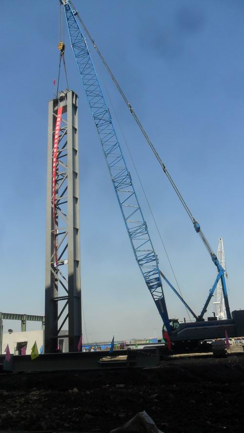 此次吊装的E列15线钢柱下柱重约49吨,吊车梁底标高28.3m,杯口基础-2.9m,为确保此次钢柱的顺利吊装,项目部与工程处相关负责人精心组织和准备,对履带吊站位、回转半径、提升高度、吊臂是否卡杆进行了精确的计算,最终采用一台160t履带吊进行吊装,确保钢柱吊装工作顺利完成。