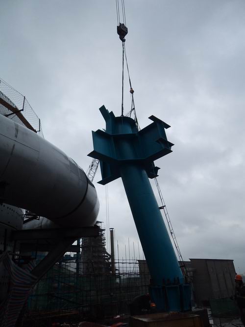 该高炉本体框架柱设计为钢管混凝土结构,下框架柱钢管规格为Φ1200mm*25mm,上框架柱钢管规格为Φ800mm*25mm。此次吊装的下框架柱安装标高12.5m,重15t。项目部认真落实“树正气、讲责任、比贡献”主题劳动竞赛活动,精心部署,合理安排构件进场,克服施工场地狭小等困难,顺利完成了该节点任务。