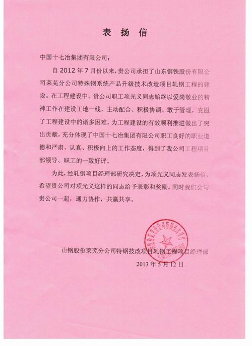 日前,山钢股份莱芜分公司特钢技改项目轧钢工程项目经理部发来表扬信,表扬山东分公司莱钢项目部工程部技术员项光义在轧钢工程中的做出的突出贡献。